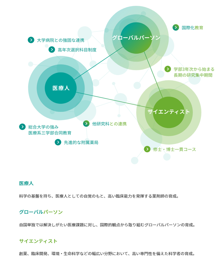 薬学部と慶應義塾大学病院薬剤部は教育・研究、薬剤部業務において強固に連携しています。これを実現している仕組みのひとつが人事面での交流です。病院薬剤部長や附属薬局長は、薬学部教員を兼任し、勤務する薬剤師も薬学部の教育に携わっています。